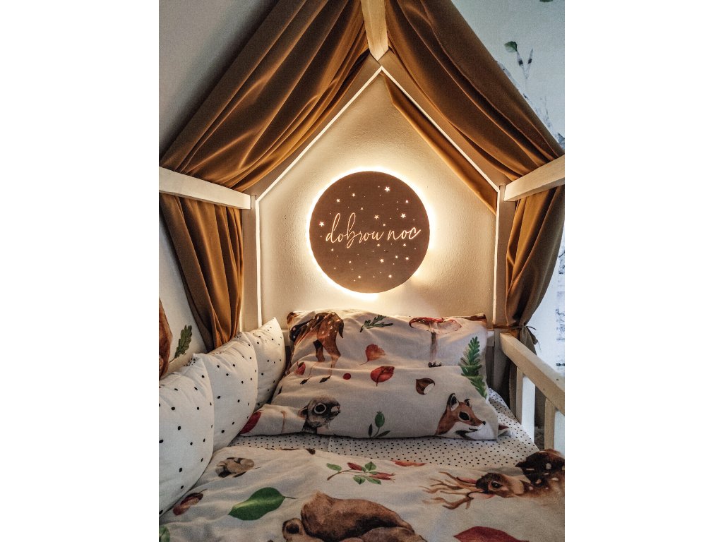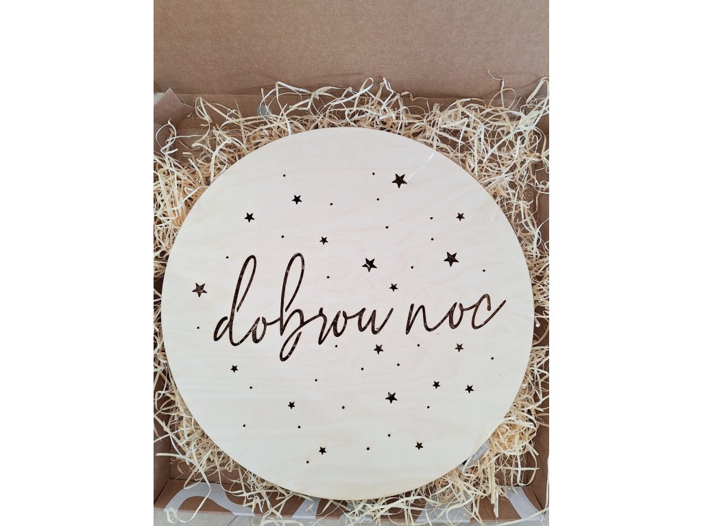 Dřevěná dětská noční lampička s motivem hvězdiček a nápisem "dobrou noc".